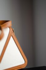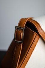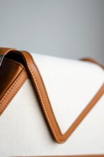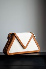 An envelope shaped handbag in creamy coloured canvas and brown leather combination. This shoulder bag comes with a short leather strap to be styled the way you want. This bag, for sure would add exceptionality to your taste of fashion.
